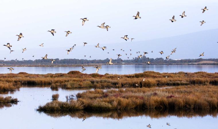 È una porzione dell’enorme territorio paludoso a sud di Oristano bonificato tra 1934 e 1937. S’Ena Arrubia, incastonato fra pineta costiera e lunghissima e sabbiosa spiaggia della Marina di Arborea, è ‘il relitto’ del grande stagno salato di Sassu, in origine suddiviso in 200 piccole e grandi aree palustri ed esteso più di tremila ettari. Oggi lo stagno arborense comprende un decimo di quell’enorme estensione ed è divenuto un bacino indipendente, salvatosi dal prosciugamento e alimentato da canali artificiali di acqua dolce. Lo scarico a mare avviene tramite saracinesche poste vicino al borgo di pescatori di Marceddì, dominato dalla cinquecentesca Torrevecchia. Qui una cooperativa regolamenta l’attività nelle acque dello stagno e ogni anno cattura molti quintali di anguille, carpe, muggini e spigole, che arrivano sui tavoli dei ristoranti locali e di tutta l’Isola.