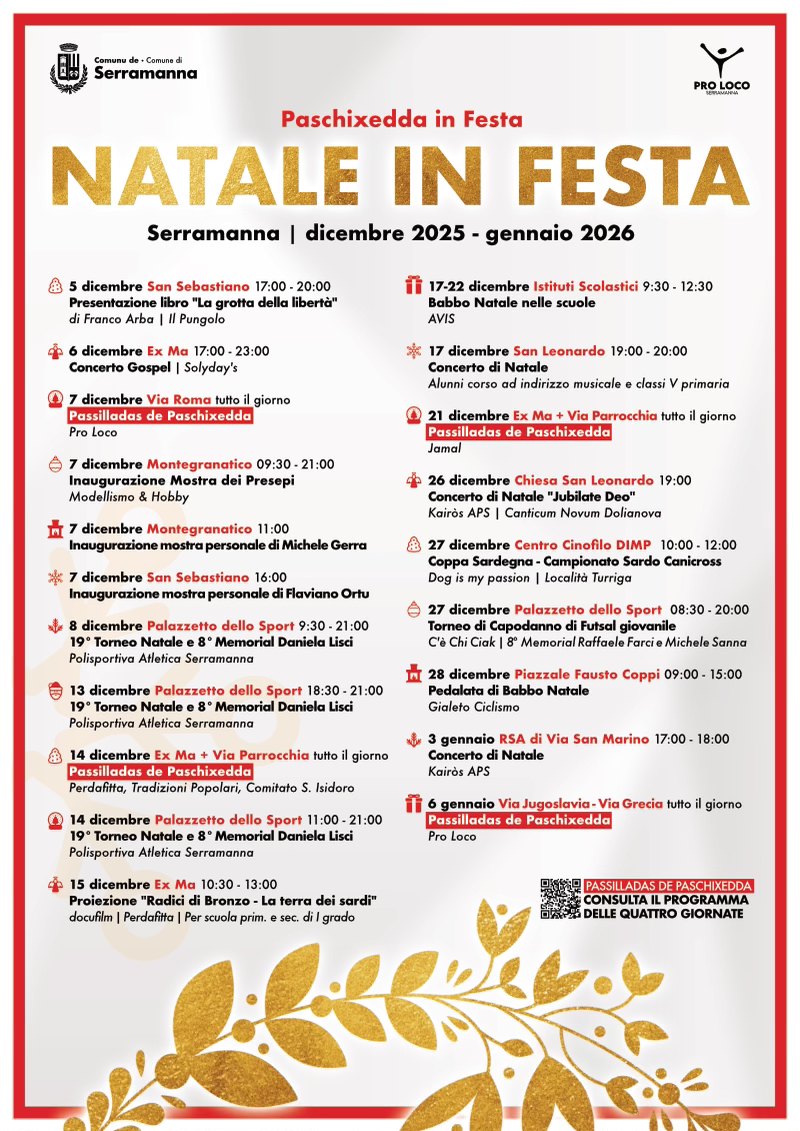 La magia del Natale invade il Medio Campidano e avvolge Serramanna per un mese con tantissimi appuntamenti: dal 5 dicembre 2025 al 6 gennaio 2026 tornano il Natale in Festa e le giornate speciali di Passilladas de Paschixedda.