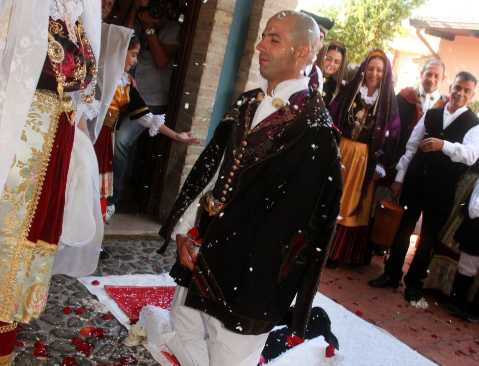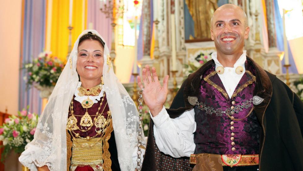 La lunga celebrazione è in sardo campidanese. Dopo lo scambio degli anelli, le mani degli sposi sono unite da sa cadena, la catena nuziale, molto più che un semplice legame, simbolo di fede e vincolo perpetuo. È costituita da 66 anelli d’argento, elementi che esprimono carattere di un’intera comunità e unione ininterrotta fra tradizione e modernità. Accanto a sa cadena convivono armonicamente abiti in broccato, veli di pizzo ricamati a mano e, a suggellare l’incanto, il fasto de is prendas, ori e gioielli antichi. Terminata la funzione religiosa gli sposi escono fra gli applausi accompagnati dal lancio di due colombe. La celebrazione prosegue nella vicina chiesa di san Giuliano, dove gli sposi scrivono la promessa d’amore che sarà custodita nel piccolo santuario romanico e svelata solo dopo il venticinquesimo anno di matrimonio (con lettura del primogenito). A conclusione, su cumbidu, il banchetto nuziale, preceduto dai classici riti di buon auspicio e prosperità, la benedizione dell’acqua, in segno di purificazione, e sa ‘razia,. Poi è tempo di festa, si sprigiona l’eco di un’Isola che si racconta. Il confine fra passato e presente diventa viaggio etnografico, restituisce un’epoca fatta di lavori nei campi, un inno a ciò che il tempo ha costruito, a ciò che la memoria ha conservato. Una storia d’amore e di comunità, che va oltre il tempo.