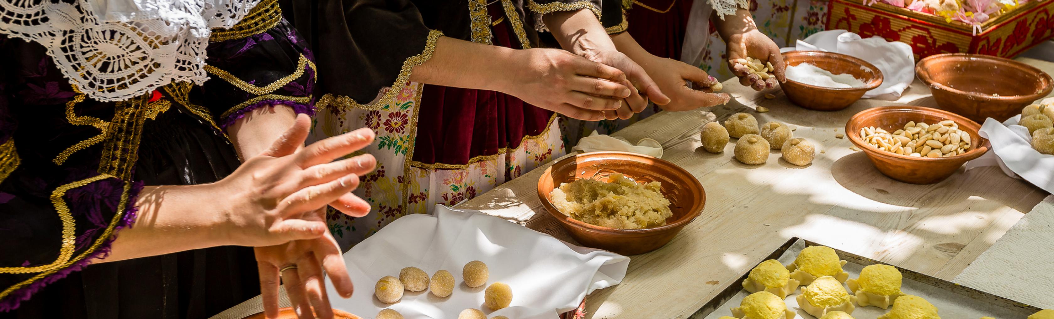 Typisch für den Karneval auf der Insel sind die intensiven Aromen und Krapfen. Is Zippulas, die Zeppole von Campidano, sind köstliche, längliche Pfannkuchen mit einem Boden aus Safran und Zitrusschalen, die mit Vernaccia aromatisiert sind. Sie nennen sich Sas Cattas in Barbagia, Li Frisjoli in Sassarese und Frisgioli Longhi in Gallura. Das Rezept und die Form unterscheiden sich von Parafrittus oder Frati Fritti, die rund sind und in der Mitte ein Loch haben. Manchmal sind die Krapfen mit Sahne oder Honig gefüllt und duften nach Filu 'e ferru. Sehr schmackhaft sind Sos Rujolos, frittierte Käsebällchen, die typisch für die Region Nuoro sind. Ruioli, Arrubiolos, Orubiolus sind die Bezeichnungen für die verschiedenen Gebiete. Der Name erinnert an Ravioli und kehrt zu den südlichen Köstlichkeiten zurück: Cruxioneddus de Mindua sind frittierte Ravioli mit Mandelfüllung, die manchmal durch Sahne oder Ricotta-Käse ersetzt werden. Eine Spezialität, die mit der Landwirtschaft und insbesondere mit der Schweinezucht verbunden ist, sind die Culingionis de Sambene Dulche, die eine Füllung aus Blutwurst (süßes Schweineblut) enthalten. Die Favoriten der Kinder sind die ursprünglich aus der Gallura stammenden Li Acciuleddi: frittierter Teig in Form von Zöpfen, überzogen mit Honig (oder Zucker) und buntem Konfetti. In einigen Zentren werden sie als Mangadagas oder Trizzas zubereitet, ähnlich wie in Honig getränkte Spaghetti, die gefaltet und zu einem Zopf aufgerollt werden. Vergleichbar sind die Orillettas, eine sardische Version der Chiacchere aus anderen Regionen, ursprünglich aus Baronia, aber überall verbreitet, knusprig und köstlich, fröhlich und leicht, wie die festliche Atmosphäre, die sie schaffen.