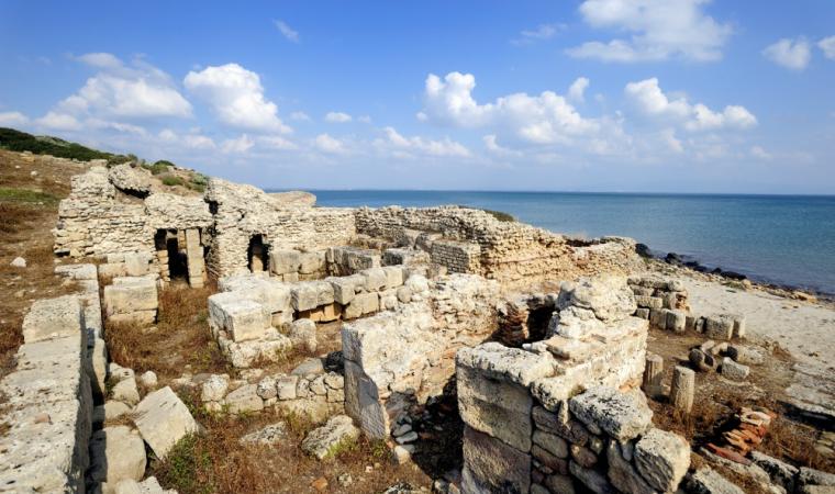The Phoenician legacy includes two necropolises and the tophet, a cemeterial shrine where urns containing the cremated remains of newborn babies and animals sacrificed were placed. With the advent of Carthage, burial accompanied cremation, Phoenician pit tombs were reused and ‘chamber tombs’ were added, indicated by rods with images of the deities Baal Hammon and Tanit. Thousands of grave goods artefacts come from the burial areas: ceramics, jewellery, amulets, scarabs. Under Punic domination, the districts of Tharros, including the artisan district specialized in iron metallurgy of Montiferru, extended in ‘terrace’ style on the hill of San Giovanni, where the defensive walls of the fortified city began. Before the Roman conquest (238 BC) civilian and religious buildings were erected, including the temple ‘of the Doric semi-pedestals’, a ramp with steps, decorated in relief at the top with Doric semi-pedestals and pilasters. The temple was partly dismantled during the imperial age and a new sanctuary was built – one of many that the Romans dotted across the city. In Little Temple K, consisting of a portico and an altar with an Egyptian cyma cornice, the re-use of two blocks on which Semitic letters are engraved stands out. These are pertinent to a probable (pre-existing) ‘Punic temple of inscriptions’. The temple with a Semitic-type layout is fascinating and is delimited by rock walls on three of its four sides. In the middle, there was a fence with columns, the floor of which is decorated with a multi-coloured mosaic. The Temple of Demeter owes its name to an environment where two terracotta artefacts linked to the goddess were discovered. The Tetrastyle temple overlooking the sea will strike you: two columns (rebuilt) are still standing, along with the foundations. Numerous ‘pieces’ of the temples were reused, for example in the Church of Santa Giusta.