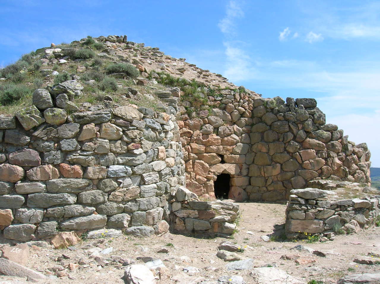 The majestic central tower, about thirteen metres high (today), dominates a village of huts extending two and a half hectares around it. Research is still ongoing and has so far ascertained that the village represents the original settlement (16th-15th century BC) of the complex. The phases of construction of the Nuragic fortress are demonstrated by the use of different techniques and materials: the keep, two of the four perimeter towers and the eastern and northern curtain walls, dating back to the 14th-13th century BC, were built with schist blocks positioned in irregular rows; the other two towers and the southern and western curtain walls were built around the 12th century BC with porphyry blocks, positioned using the polygonal technique. Close to the walls, more than one hundred perfectly worked blocks of trachyte were found and originally formed the upper part of the monument. The various phases were characterised by renovations and adaptations and, in particular, the keep underwent extensive restoration.