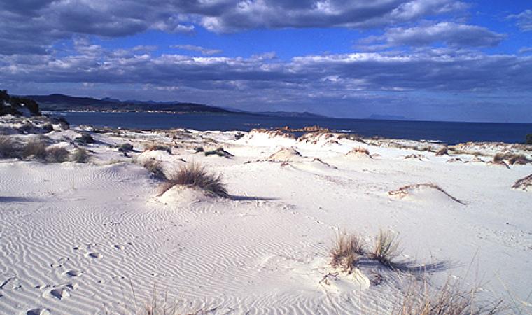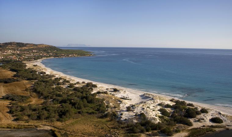 Una distesa di sabbia finissima e candida, talmente bianca da diventare abbagliante, alle cui spalle si innalzano enormi dune, tra le più grandi della costa orientale. La bellissima, ampia e lunga spiaggia di Capo Comino è un paradiso terrestre che fa parte dell’omonima borgata turistica di Siniscola e forma un unico litorale con s’Ena ‘e sa Chitta, ‘la spiaggia dei confetti’, stupendo tratto settentrionale (circa tre chilometri) del litorale. Camminando lungo il soffice arenile verso sud vedrai affiorare scogli sparsi, sino ad arrivare a Capo Comino: il promontorio è l’estremità più orientale della Sardegna che chiude a nord il golfo di Orosei. Il ‘capo’ è sorvegliato da un antico faro, simbolo del luogo, che fronteggia la piccola isola Ruja, raggiungibile a nuoto o a piedi a seconda della marea. Il porfido rosso dell’isolotto si fonde con le sfumature celesti del mare. Le acque estremamente limpide, a loro volta, si intonano con il verde della vegetazione circostante, compresa una rigenerante pineta.