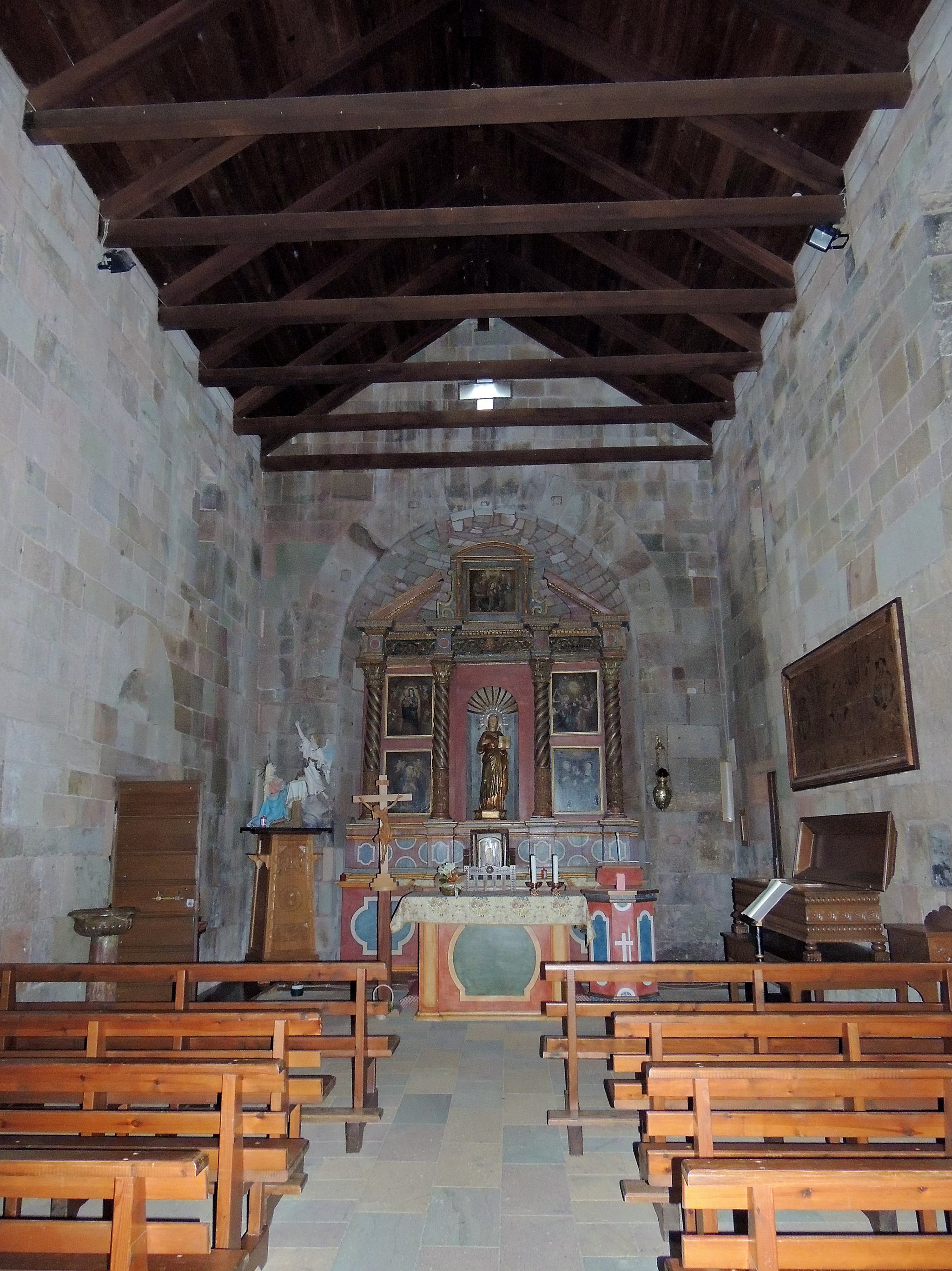 L’area dell’ex cattedrale è chiusa da un recinto fatto di cumbessias (alloggi per pellegrini) e un edificio a due piani, dove sono allestite mostre temporanee su storia del santuario e sito archeologico. La chiesa è meta di pellegrinaggio: il cortile si anima soprattutto la domenica dopo Pasqua, per la festa della Madonna di Castro. Saliti i cinque gradini della scalinata, ti colpirà la luce riflessa dai blocchi trachitici che compongono l’edificio: assumono gradazioni dal rosa intenso al rosso porpora scuro. Due lesene affiancano il portale e dividono la facciata in tre specchi, ognuno con tre archetti (nove in totale) appoggiati su peducci variamente decorati. L’interno è a unica navata, lunga 11 metri e larga cinque. L’abside semicircolare ha copertura lignea a capriate. Sulla sinistra si apre un grande portico, aggiunto posteriormente. Dall’altare ‘romanico’ ci è giunta una pergamena, conservata nella parrocchia di Oschiri, che inneggia a santa Restituta, martire africana il cui culto nell’Isola si colloca nell’alto Medioevo. Alla stessa età risalgono alcune sepolture nell’area circostante.
