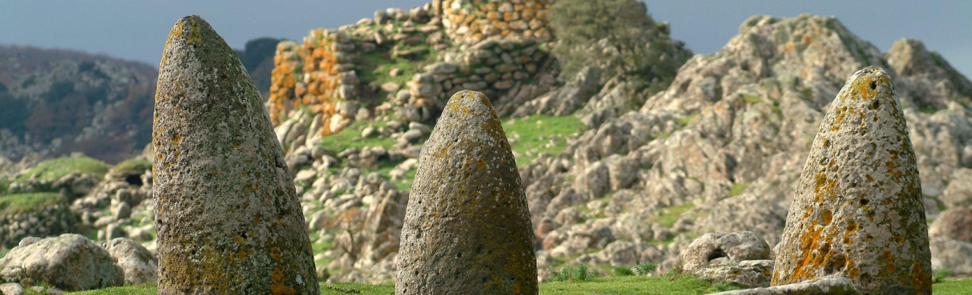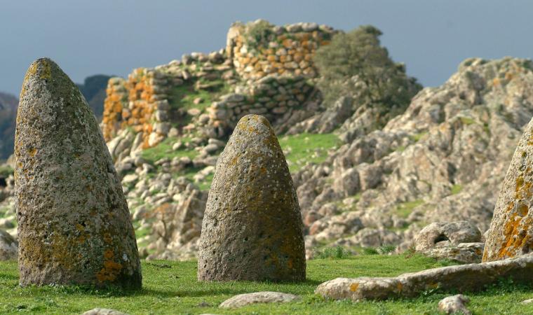 Da più di tremila anni, davanti alla sua area funeraria stazionano sei guardiani di pietra, che contribuiscono ad alimentare l’atmosfera mistica del sito. L’insediamento nuragico di Tamuli si estende lungo un pianoro a circa quattro chilometri da Macomer, centro principale del Marghine. Il complesso risale alle età del Bronzo medio e recente, tra XVI e XIII secolo a.C. Noterai immediatamente le tre tombe di Giganti disposte l’una di fianco all’altra. La tomba I è quella che si conserva meglio: presenta un’ampia esedra, percorsa da un sedile, con al centro l’ingresso, ricavato tramite un foro praticato su una lastra trapezoidale. Il corpo tombale è absidato, a pianta rettangolare. Sul lato sud della tomba osserverai l’elemento più caratteristico del sito, conosciuto localmente come sas perdas marmuradas: si tratta di sei betili antropomorfi, di forma conica, schierati in due nuclei.