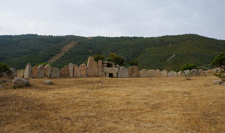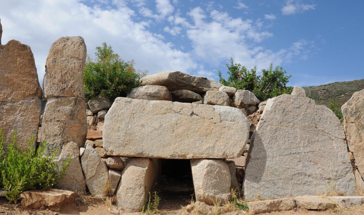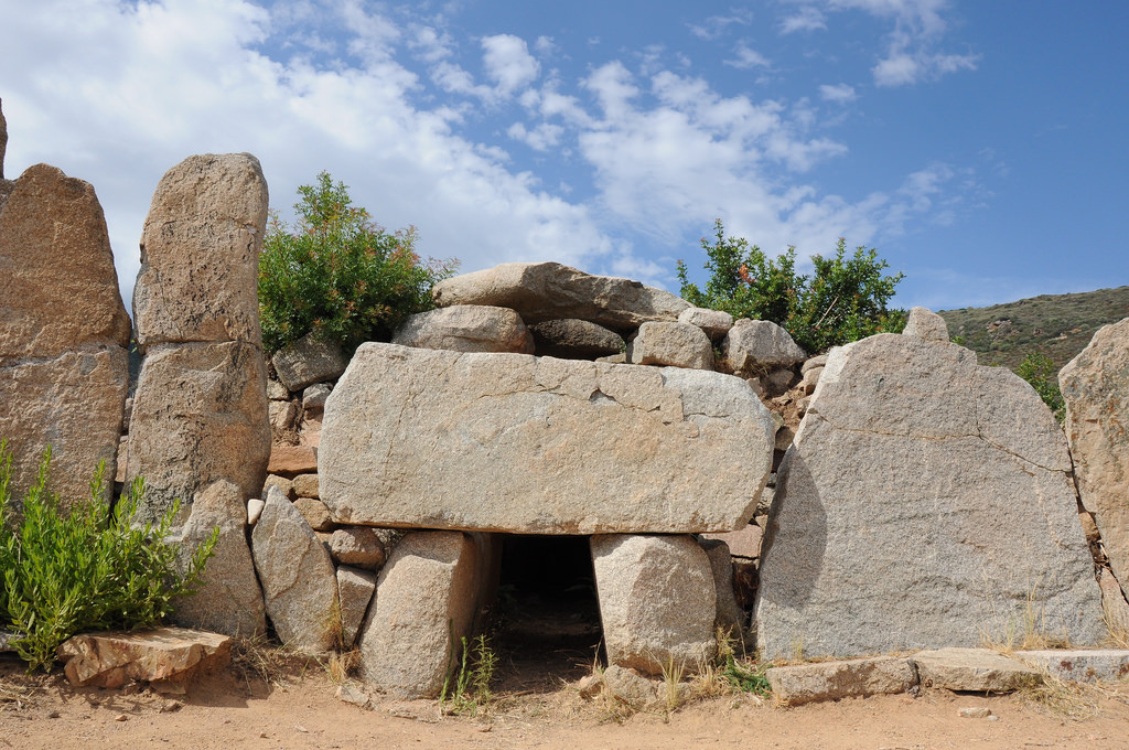 L’ingresso è architravato e introduce alla camera funeraria, lunga poco più di dieci metri. È costruita con blocchi di granito in filari aggettanti, mentre nel tumulo sono stati usati anche scisto e calcare. La copertura è a piattabanda, ne vedrai ancora in posa sette grandi lastroni. L’esedra, forse realizzata durante una seconda fase costruttiva (intorno al X secolo a.C.) conta ventidue monoliti granitici infissi a coltello sul terreno. Grazie ai materiali rinvenuti durante le campagne di scavo è stato possibile datare la frequentazione del sito dal Bronzo medio (XVI a.C.) all’età imperiale, in quanto alcuni reperti risalgono sino al III secolo d.C. Da allora la tomba è sempre rimasta nascosta, ‘protetta’ da terriccio e da fitti cespugli di lentischi e rovi. Attorno, noterai tracce di altri ambienti non ancora indagati, la cui funzione rimane per ora sconosciuta. Oltre al Supramonte di Baunei, la vista dal pianoro dove sorge la tomba ti permetterà di ammirare le colline circostanti a nord e a ovest, mentre in direzione sud-est la tua vista si aprirà sulla vallata di Ardali, giungendo fino a scorgere in lontananza il litorale di Arbatax.