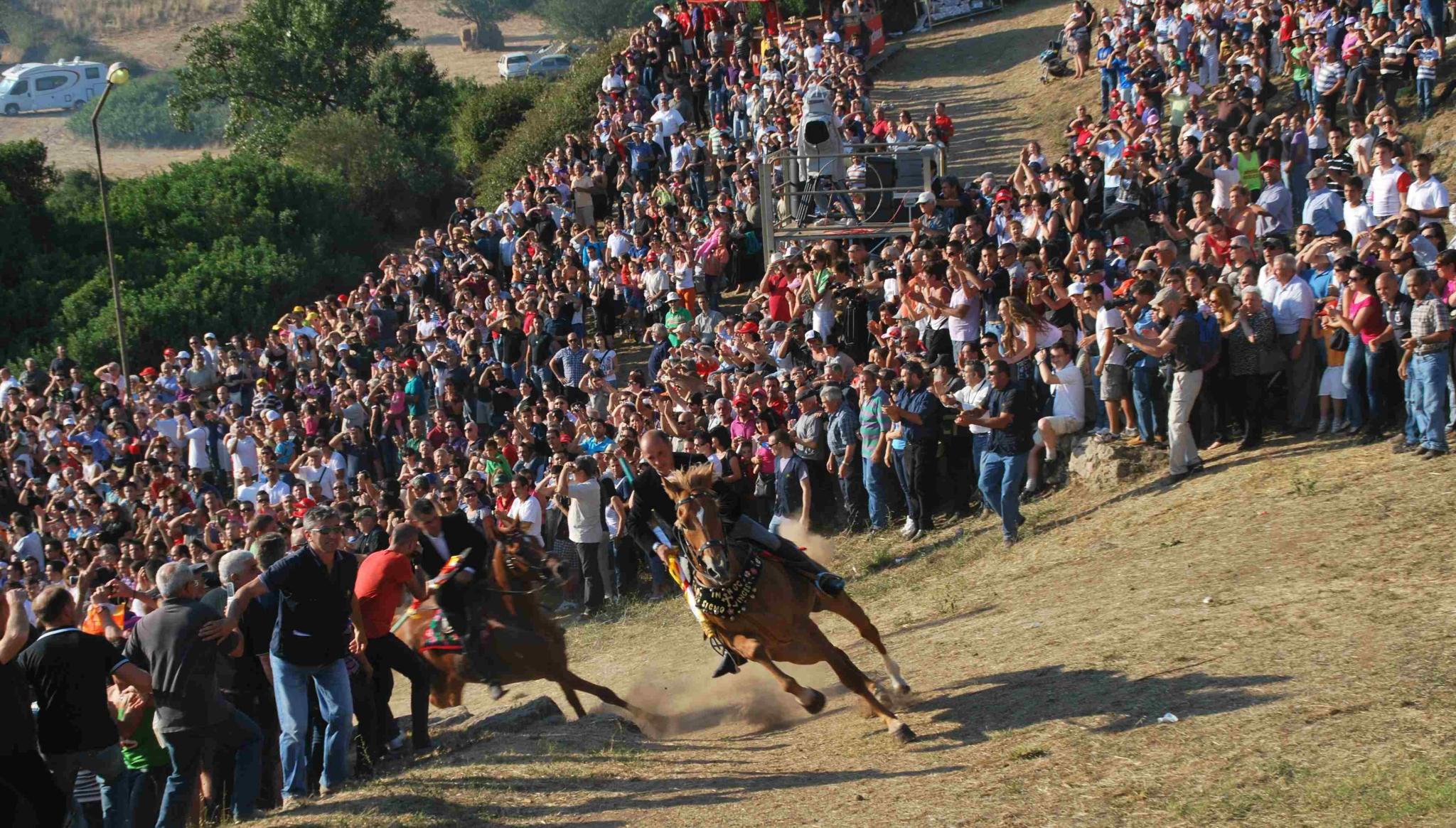 A dare origine alla festa sedilese sarebbe stata un’altra visione mistica, di don Giommaria Ledda, che, schiavo dei mori, edificò l’affascinante santuario di santu Antine, di origine medioevale, poi ricostruito in forme gotiche nel XVII. La chiesa è meta della sfrenata corsa a cavallo del 6 e 7 luglio. I cavalieri si radunano nel pomeriggio del 6 davanti alla casa del parroco, per la consegna de sa pandèla (il vessillo) al capocorsa e ai due cavalieri da lui scelti, ossia seconda e terza pandela. Un corteo di Autorità e circa cento cavalieri procede a passo d’uomo fino ad affacciarsi a su Frontigheddu, a sud dell’abitato, un piccolo promontorio naturale da cui si può scorgere lo scenario: la folla di fedeli e visitatori in fervida attesa riempie la vallata del santuario, anfiteatro naturale dell’evento. L’Ardia parte all’improvviso, nella polvere, tra gli spari dei fucilieri, che aprono la strada al corteo, e l’incitamento del pubblico.