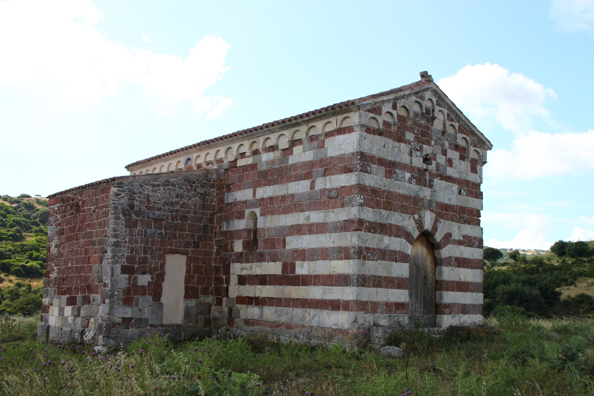 All’esterno risalta immediatamente l’uso di materiali diversi, trachite rossa e arenaria bianca, che danno alla chiesa l’aspetto bicromo tipico di numerosi santuari romanici del nord della Sardegna. La facciata è semplice, decorata da nove archetti che seguono la linea degli spioventi del tetto e proseguono nelle fiancate. Sopra il portale si trova una finestra cruciforme. Altre monofore si aprono nei lati, nella parete est dei bracci del transetto e nell’abside. L’iscrizione della facciata, in caratteri gotici, menziona l'autore dei lavori del 1335 e il priore reggente all’epoca. A proposito di iscrizioni, ti incuriosirà osservare l’ingresso tamponato del braccio meridionale: in un blocco di arenaria, usato come stipite, compare un’epigrafe, con un riferimento al sepolcro di un santo denominato Autedus, secondo alcuni custodito dentro la chiesa. L’identificazione di questa figura rimane avvolta dal mistero: il nome non sembra comparire in alcuna fonte agiografica. Altri conci contengono graffiti e ‘orme del pellegrino’, ovvero segni lasciati nel corso dei secoli dai fedeli che si recavano in pellegrinaggio al santuario. L’aula è a navata unica con volta a botte, tra gli arredi osserverai il simulacro della santa titolare conservato in una teca dietro l’altare.
